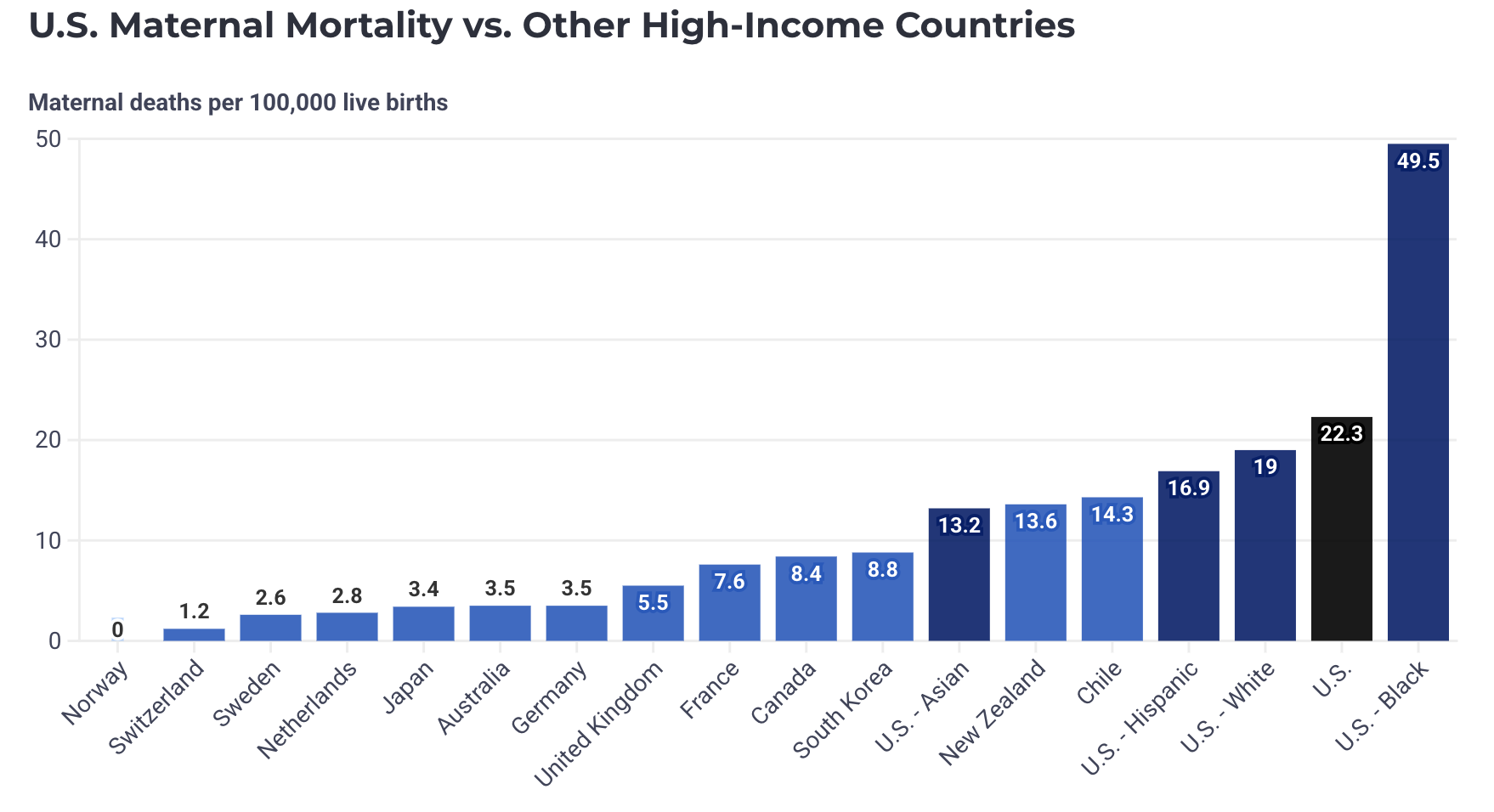 The United States has a maternal mortality rate of 22.3 deaths per 100,000 births, the highest among all high-income countries.